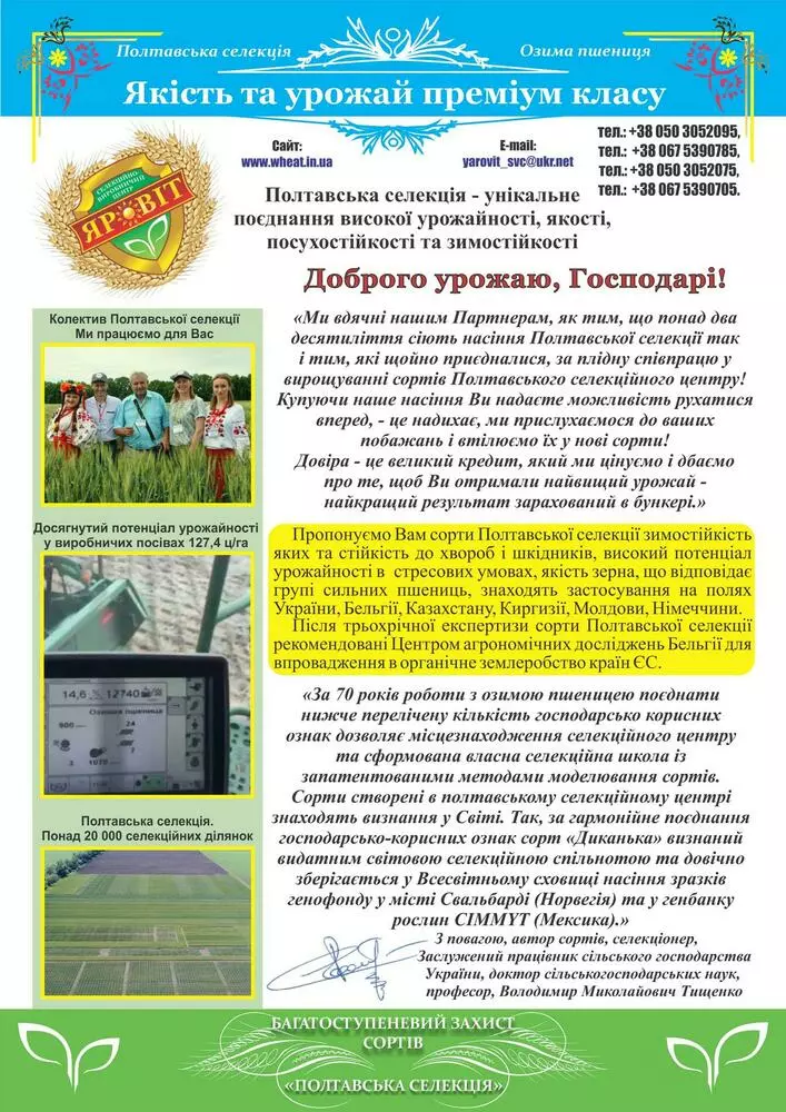 Как эксклюзивный представитель сортов Полтавской государственной аграрной академии селекционная компания «Яровит» предлагает Вам элитные семена Полтавской селекции: Озимая пшеница: Сагайдак, Вильшана, Царичанка, Кармелюк, Полтавчанка, Зеленый гай, Левада, Диканька, Оржица, Соната Полтавская, Самара 2, Санжара
